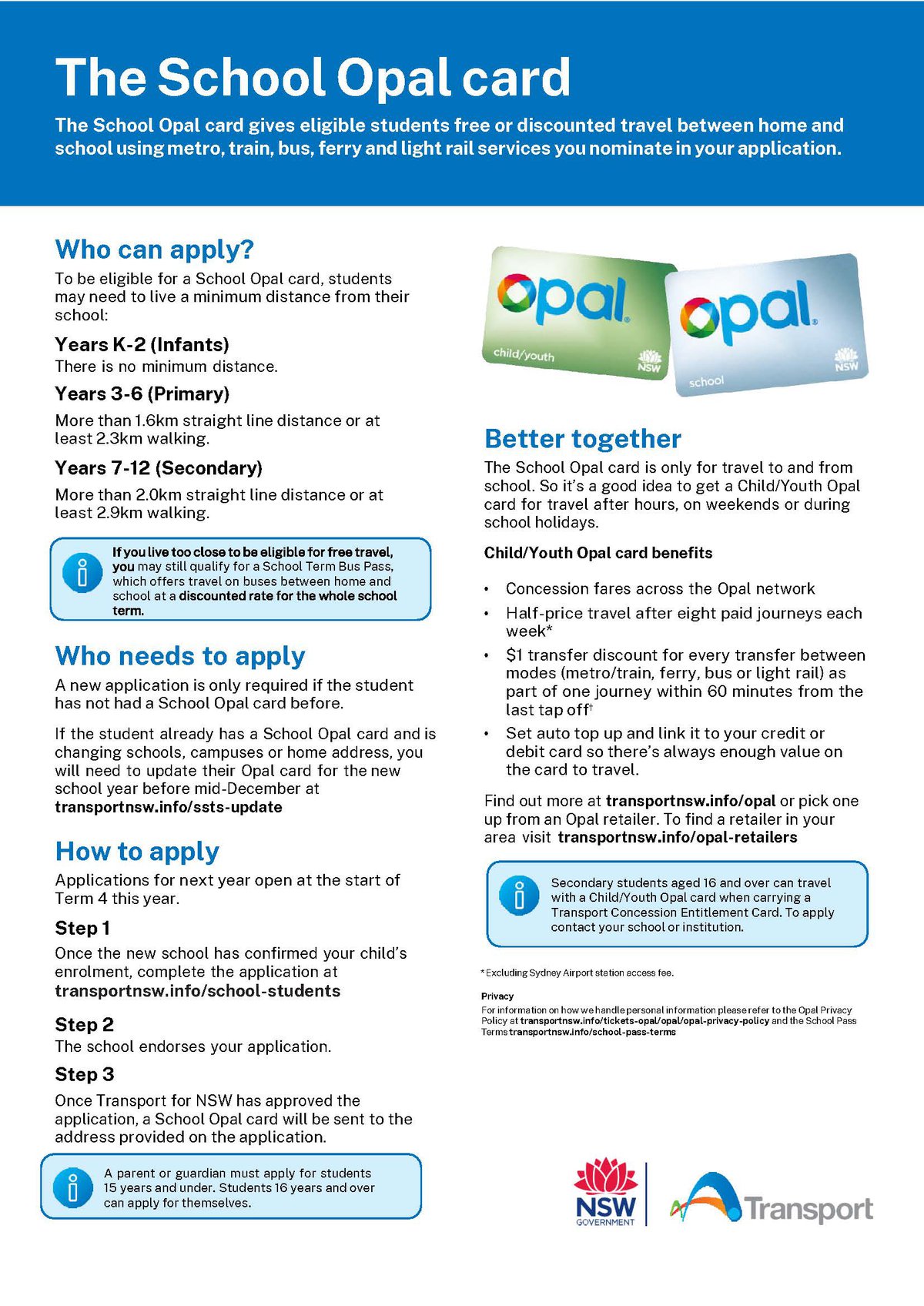 School Travel Passes Students who require a School Opal card or travel pass but have not yet applied need to apply or update their details as soon as possible. In the Opal network, students should travel with a Child/Youth Opal card until they receive their valid School Opal card. If outside Greater Sydney, parents should contact their local bus operator to discuss their travel needs. Students living in rural and regional areas will receive their travel pass from their nominated transport operator. It may be issued via their school or be sent directly to them at home. Note: some rural and regional operators do not issue travel passes. Students/parents should confirm with their nominated operator if they do not receive a pass. |